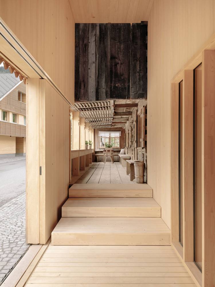 Blick vom historischen Bestand in den lichtdurchfluteten Neubau: Der starke Kontrast zwischen dunklem, gealtertem Holz und hellen, klaren Oberflächen unterstreicht den Dialog zwischen Alt und Neu im Museum Bezau