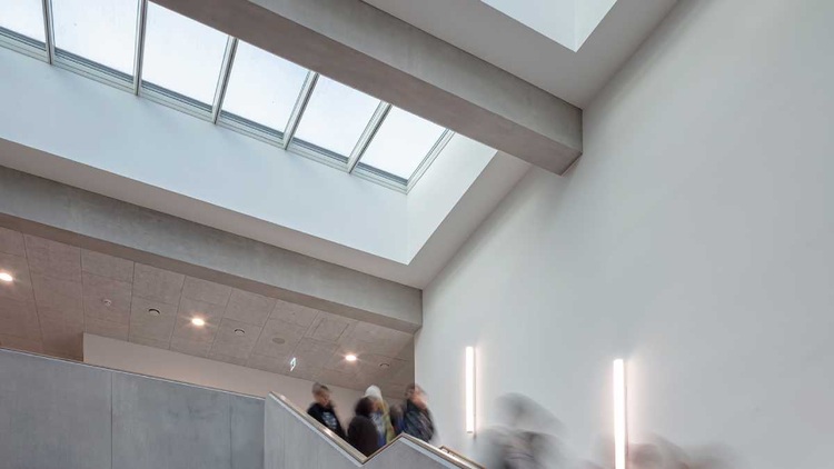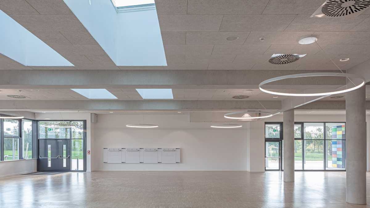 Die Entscheidung fiel auf großzügige Lichtbänder mit Velux Modular Skylights, die heute für eine gleichmäßige, blendfreie Belichtung in den zentralen Bereichen der Schule sorgen – vom Foyer über Erschließungszonen bis zu Aufenthalts- und Versammlungsräumen. Die 43 verbauten Module, 21 fest verglaste und 22 zu öffnende NRWG-Module, bringen natürliches Licht bis tief ins Gebäudeinnere und erfüllen zudem die Anforderungen an Rauch- und Wärmeabzug (RWA). Sie verfügen über eine hochwertige 3-Scheiben-Isolierverglasung mit leichtem Sonnenschutz (g-Wert: 24 %). Die Ansteuerung der RWA erfolgt dabei über ein offenes bauseitiges System.