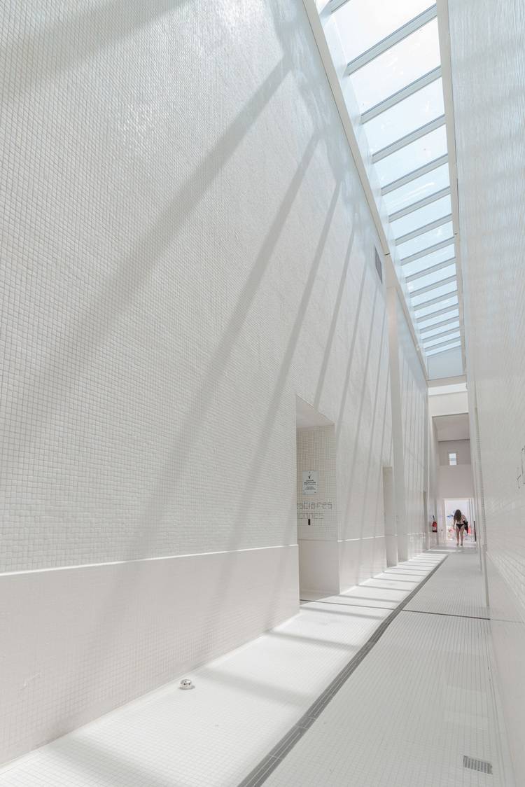Einer dieser Orte war das öffentliche Bad von Architekt Jean Nouvel, das in den Jahren 2004 bis 2008 geschaffen wurde. Das zentrale Merkmal des Baus ist die Komposition aus kubischen Volumen und Lichtstimmungen des Wassers. Die strahlend weiße Farbgestaltung sowie die reduzierte Architektursprache des Zentrums sollen dabei an natürliche Gewässer erinnern. Die einzige Ausnahme des monochromen Farbschemas bildet eine bunte und lebhafte Spielfläche für Kinder an der Innenseite der Anlage. Charakteristisch sind zudem die nach Zufallsprinzip in der Fassade verteilten Fenster bzw. Öffnungen, die von außen einen Blick auf die Bäder ermöglichen. Die Vorsprünge, Nischen und Absenkungen formen den Innenbereich des Zentrums.