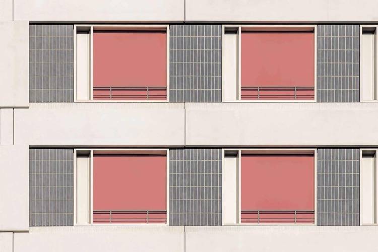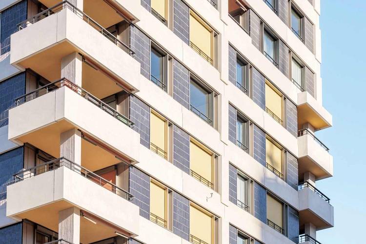 Dazu gesellt sich das individuelle Spiel farbiger Markisen. Neben der ordnenden Betonstruktur sind sie das äußerliche Merkmal, das am stärksten in Erscheinung tritt. Rund 1300 gelbe und rote Warema Vorbau-Markisen mit nicht brennbarem SecuTex-Gewebe A2 schützen die Wohneinheiten in den Türmen vor Überhitzung. Gemäß den schweizweit gültigen Brandschutzvorschriften der VKF waren hier aufgrund der Gebäudehöhe von über 30 Metern nicht brennbare Markisenstoffe gefordert.