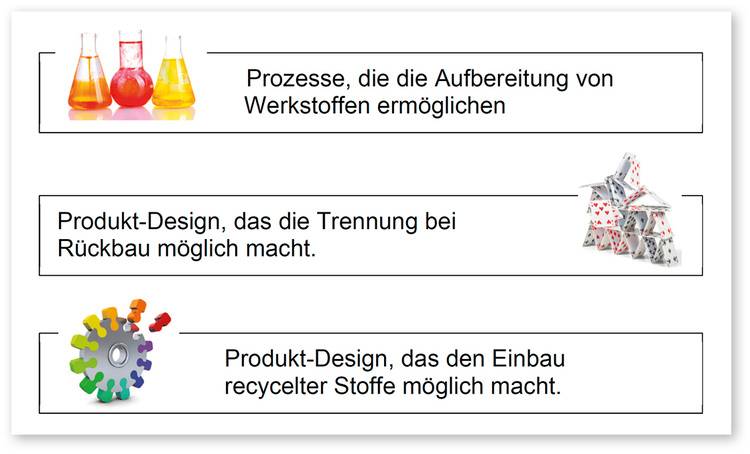 Recycelte Materialien werden heute als Kaufargument genutzt. Neue Produkte sollten natürlich schon unter dem Gesichtspunkt der leichten Trennbarkeit und Sortenreinheit bei den Werkstoffen konzipiert sein, um ein sortenreines Recycling zu ermöglichen. Zukünftig ist eine artgleiche Wiederverwendung auf gleichem Qualitätsniveau von Materialien anzustreben