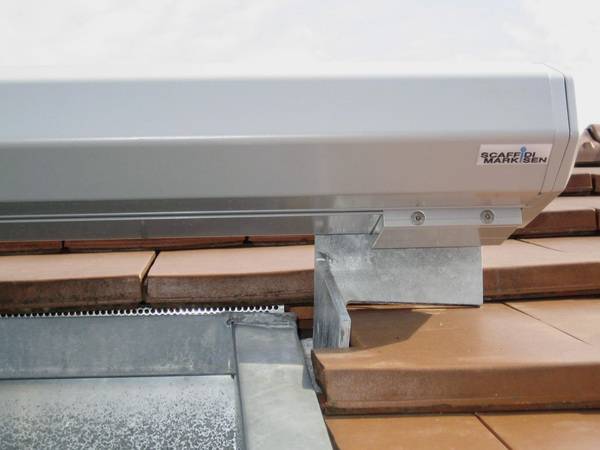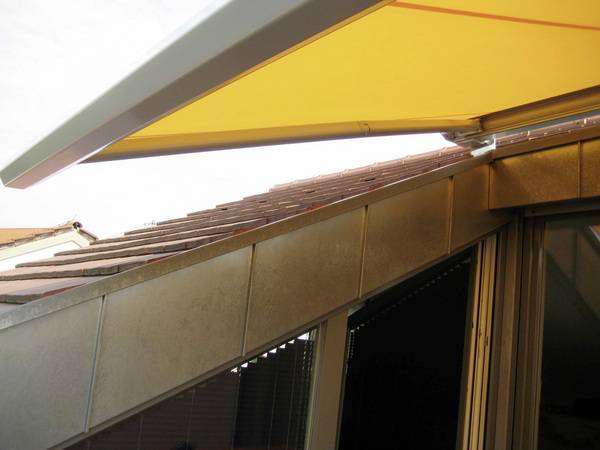 Das hier gezeigte Montagebeispiel zeigt eine klassische Lösung, bei der die Markise auf das Dach montiert wird, um eine entsprechende Kopffreiheit erreichen zu können. Im Prinzip wird hier die normale Montage mit Dachsparrenhaltern auf den Kopf gestellt. Der wesentliche Unterschied zu der klassischen Dachsparrenmontage unterhalb der Sparren liegt in der Genauigkeit, mit der die notwendigen Spezialkonsolen ausgemessen und hergestellt werden müssen. Fachbetriebe tun gut daran, die notwendigen Konsolen beim Markisenlieferanten mit zu bestellen, um die betrieblichen Anforderungen nach Eurocode zu umgehen, zertifiziert zu sein, um Statikkonsolen bei der Herstellung mit einem CE-Zeichen versehen zu können.