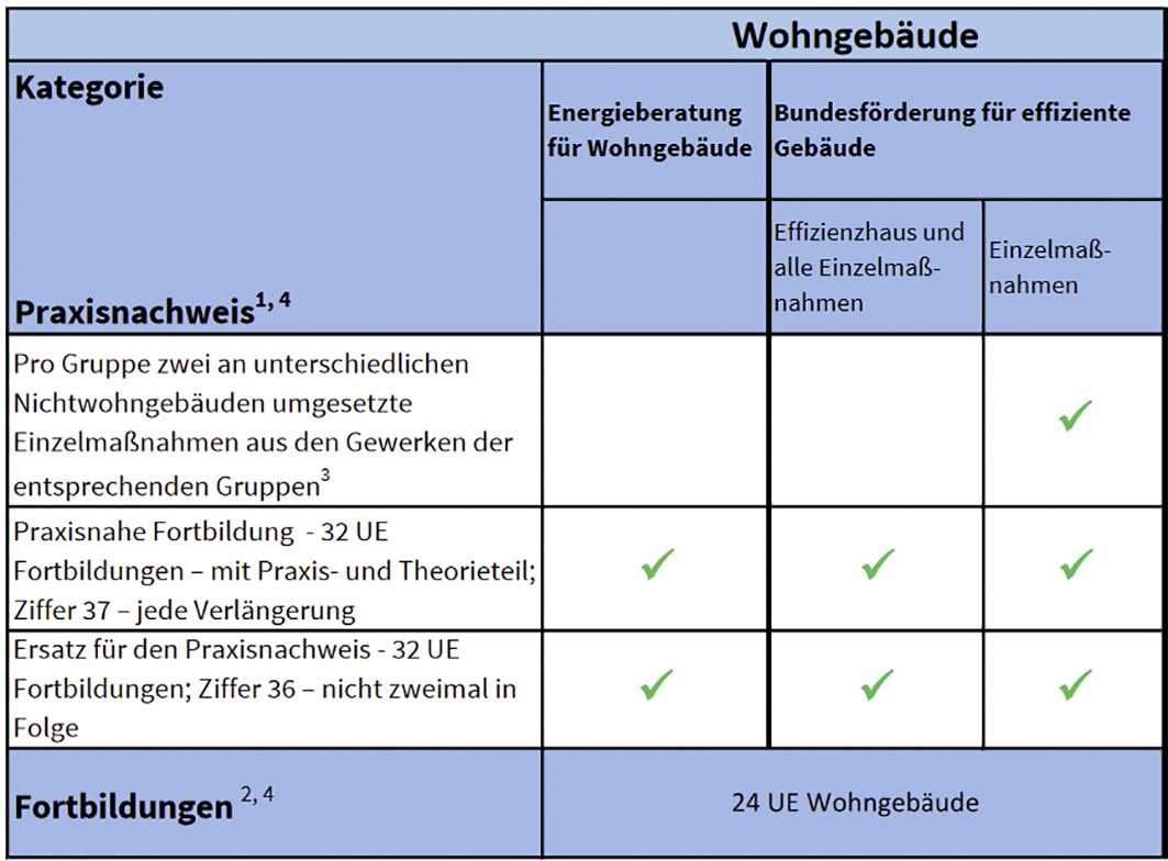 Für geförderte Projekte ist es zudem notwendig, in der Energie-Effizienz-Expertenliste gelistet zu sein. Um die Listung zu behalten, müssen Energieberater ihre fortlaufende Weiterqualifikation nachweisen. Acht Unterrichtseinheiten pro Jahr und pro Listeneintrag und Praxisnachweise sind für jeden Pflicht.