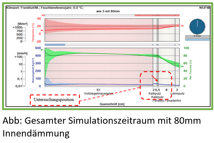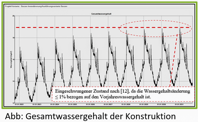 Da es sich bei der Bestandswand um ein zirka 50 Zentimeter dickes Klinkermauerwerk auf der Westseite handelt und das Gebäude sich in einer „Schlagregenbeanspruchung Zone 3“ befindet, ist ein vereinfachter Feuchteschutznachweis nach der DIN 4108 -3 (Glaser) nicht zulässig. An dieser Stelle muss zur Sicherstellung der Funktionstüchtigkeit der energetischen Maßnahme in der Regel eine hygrothermische Simulation nach der DIN 15026 ausgeführt werden.