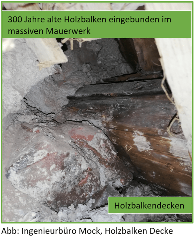 Zu erkennen ist auf Abb. 2 ein denkmalgeschütztes Gebäude aus dem 17. Jahrhundert. Schwere massive Außenwände im Erdgeschossbereich, kombiniert mit einfachsten Fenstern, einbindende Holzbalkendecken, ein aufgesetztes Fachwerk ab dem ersten Obergeschoss sowie ein unbeheizter Dachstuhl.