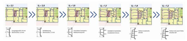 Die Abbildung zeigt an exemplarischen Schnitten, wie mit den Maßnahmen der Uf-Wert mit insulbar Isolierprofilen schrittweise wärmetechnisch optimiert werden kann. Schließlich sind der wärmetechnischen Optimierung anhand nur eines einzelnen Einflussfaktors funktionale und mechanische Grenzen gesetzt. So sind beispielsweise bestimmte Mindest-Wandstärken nötig, um die geforderte Festigkeit des Wärmedämmprofils zu gewährleisten. Stimmt man aber die Einflussgrößen fein aufeinander ab, lassen sich in der Kombination die optimale Wärmedämmung und der gewünschte Uf-Wert bei der jeweiligen Ansichtsbreite erreichen. So lassen sich wertvolle Energie einsparen und gleichzeitig der Wohnkomfort deutlich verbessern. —