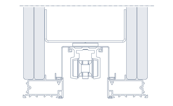 Der Bajonett-Verschluss verbindet die Aluminium-Laufschiene mit dem Oberprofil der Stahlzarge. Dadurch ist das Schiebetürsystem enorm stabil und kann auch größere Türblattgewichte aufnehmen. Die linienförmige Kontur zwischen Rollen und Schiene sorgt für eine gleichmäßige Gewichtsverteilung und somit für einen ruhigen Lauf. Zudem wird so der Verschleiß der Kunststoffrollen verringert. Da die Laufschiene schräg im Laufwagen platziert ist, zentriert sich das Türblatt von selbst und erleichtert so die Montage.