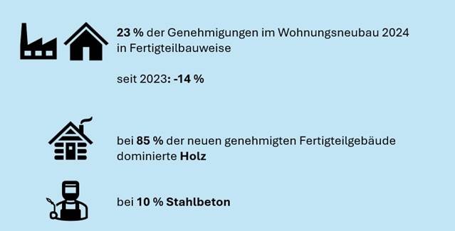 Wenn man die Fertigstellungen des laufenden Jahres absehen will, ist ein Blick auf die Genehmigungen des Vorjahres unausweichlich. Und hier ist für den Fertigteilbau zunächst zu konstatieren: Die Wohnungsbaugenehmigungen entwickelten sich 2024 im Fertigteilbau rückläufig zum Vorjahr – und zwar deutlich, wenn auch weniger deutlich als der übrige konventionelle Massivbau.