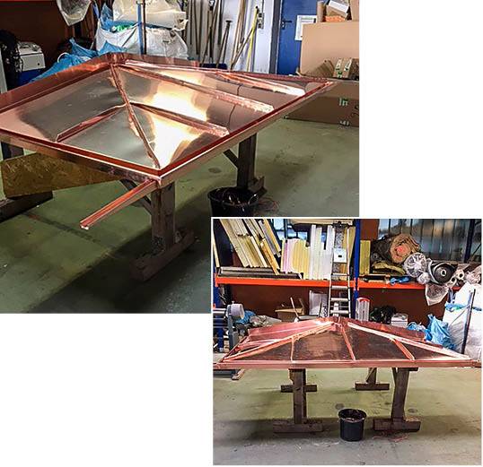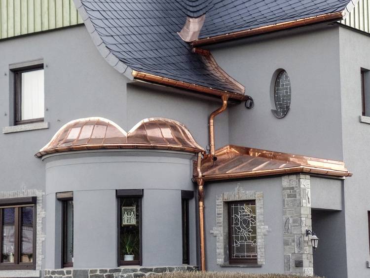 Die Traufe der etwas größeren Terrassenüberdachung aus Kupfer weist als Spezialeffekt einen Knick in der Traufe auf, der sich fachgerecht in der Rinne und der Traufbekleidung fortsetzt. Aber auch die Schareinteilung des Terrassendaches wurde fachgerecht geplant und ausgeführt.