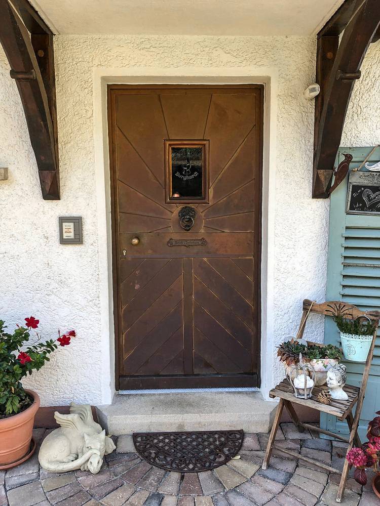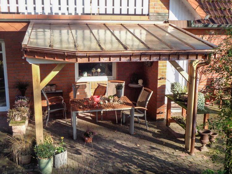 Eine Vordachschönheit ganz anderer Art hat Flaschnermeister Uwe Burghardt aus Bad Liebenzell im Nordschwarzwald realisiert. Der schwäbische Tüftler hatte vor ein paar Jahren Blechreste zu Dachschindeln verarbeitet und damit sein Vordach gedeckt und die darunterliegende Eingangstür bekleidet. Während kleinteilige Kupferschindeln die steil geneigte Satteldachkonstruktion vor dem rauen Schwarzwaldklima schützen, laden strahlenförmig auf der Haustüre angeordnete Kupfertafeln den Besucher ein, das Liebenzeller Flaschnerhaus mit dem besonderem Flair zu betreten – wundervoll!