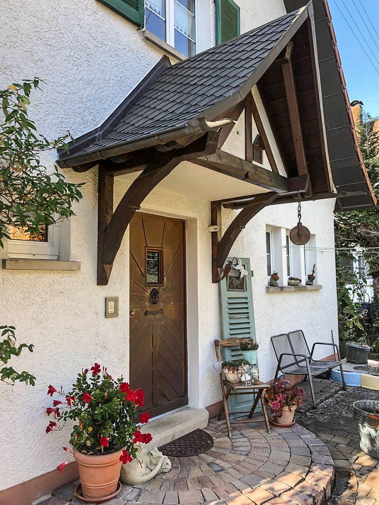 Ein weiteres und wunderschön renoviertes Vordach über dem Hauseingang gehört zu einem alten Rieghaus. Es befindet sich in Langenthal im Schweizer Mittelland zwischen Olten und Bern. Was in der Schweiz das Rieg- oder Riegelhaus, ist in Deutschland das Fachwerkhaus. In weiten Teilen der Schweiz prägt historisches Holzfachwerk das Erscheinungsbild historischer Ortsteile.
