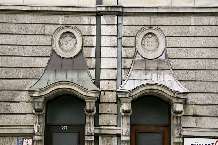 Die hier mit einer geschwungenen Vordachkonstruktion geschmückte Fassade ist ein schönes Ausführungsbeispiel. Die doppelt (konvex und konkav) gekrümmten Kupferscharen wurden mit klassischen Stehfalzen verbunden. Das Team um Spenglermeister Peter Langguth entschied sich aus optischen Gründen dafür, die Doppelstehfalze als Zierfalze mit 18 mm Falzhöhe auszuführen. Sehens- und lesenswert ist auch die über dem Vordach angebrachte Wandbemalung mit der Aufschrift: „Wem diese Bauart nicht gefällt, der baue besser für sein Geld.“