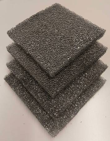 Den Holz- und Metallschaum einfach in eine Schüssel geben und vermischen, funktioniert nicht. Das liegt daran, dass der Metallschwamm am Fraunhofer IWU nicht geschäumt, sondern im Gießverfahren hergestellt wird. So entsteht eine offenzellige Metallstruktur, die einem Schwamm ähnelt, mit vielen kleinen Hohlräumen. Der Metallschwamm wird zurzeit in Platten mit einer Größe von 250 x 250 x 30 mm hergestellt. Die Holzschaummasse, eine steife Masse ähnlich dem Eischnee, muss nachträglich in die Metallschaumplatte eingebracht werden.