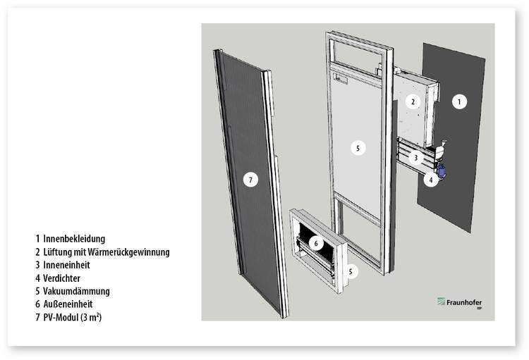 Forscherteams am Fraunhofer IBP und am Fraunhofer IEE entwickeln derzeit mit Projektpartnern aus der Industrie eine sogenannte Erneuerbare Energien-Modulfassade (EE-Modulfassade), die das Gebäude umweltfreundlich mit Strom versorgt und damit die Räume beheizt, kühlt und lüftet. Herzstück des Moduls ist eine PV-Anlage, die mit einer Wärmepumpe als hocheffizientem Wärme- und Kälteerzeuger kombiniert ist, sowie ein dezentrales Lüftungsgerät mit Wärmerückgewinnung enthält. Alle erforderlichen anlagentechnischen Bauteile sind in dem EE-Modul-Fassadenelement untergebracht, was einen hohen Vorfertigungsgrad ermöglicht (Abb. 1, 2). Das Bundesministerium für Wirtschaft und Energie fördert das Verbundforschungsvorhaben.
