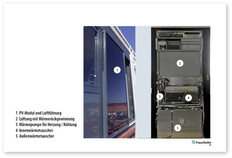 Das integrierte PV-Modul erzeugt Energie und versorgt zum Teil die Anlagenkomponenten wie etwa die Wärmepumpe mit Strom. Diese fungiert zugleich als Wärme- und Kälteerzeuger. Sie ist somit das bestimmende Bauteil der Technikeinheit der EE-Modulfassade und wird über eine intelligente Regelung effizient betrieben. Aus einer Einheit Strom kann sie drei bis vier Einheiten Wärme produzieren. Über einen im Luftspalt hinter dem PV-Element montierten Ventilatorkonvektor entzieht der Außenluft sie die Wärme und gibt sie ebenfalls über einen Ventilatorkonvektor als Heizwärme an den dahinterliegenden (Büro-)Raum ab. Muss sie kühlen statt heizen, wird der Kreislauf umgekehrt, dabei entzieht sie die Wärme der Innenluft und führt sie an die Außenluft ab.