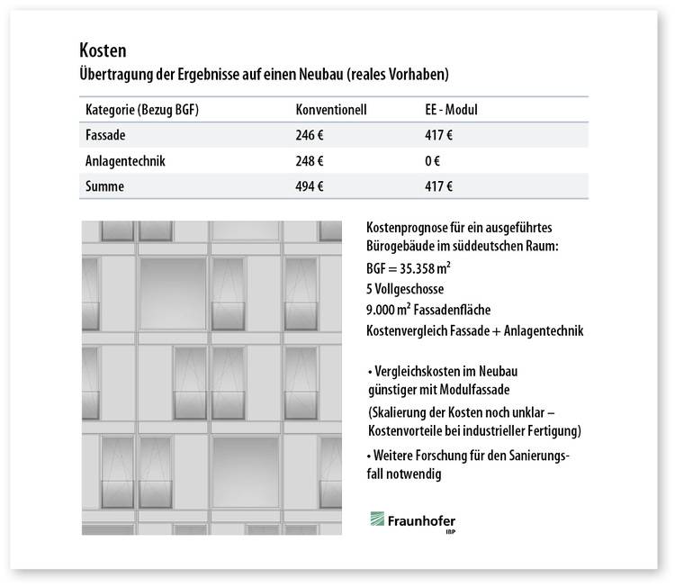 Da sich die Module vorfertigen lassen, können sie von der Stange produziert werden. Das bietet Planern und Investoren eine hohe Kostensicherheit und einen klar definierten Kostenrahmen (Abb. 3). Der Austausch erfolgt in nur wenigen Stunden. Da die Heiz- und Lüftungstechnik bereits integriert ist, müssen keine neuen Rohre im Gebäudeinneren verlegt werden. Die Fassade muss nur über einen Stromanschluss verfügen, um auch in Zeiten ohne PV-Strom die Räume klimatisieren und lüften zu können. Der Installations- und Abstimmungsaufwand an der Baustelle sinkt. Die Nutzer der Räume müssen während der Sanierung im Idealfall nicht extra ausziehen.
