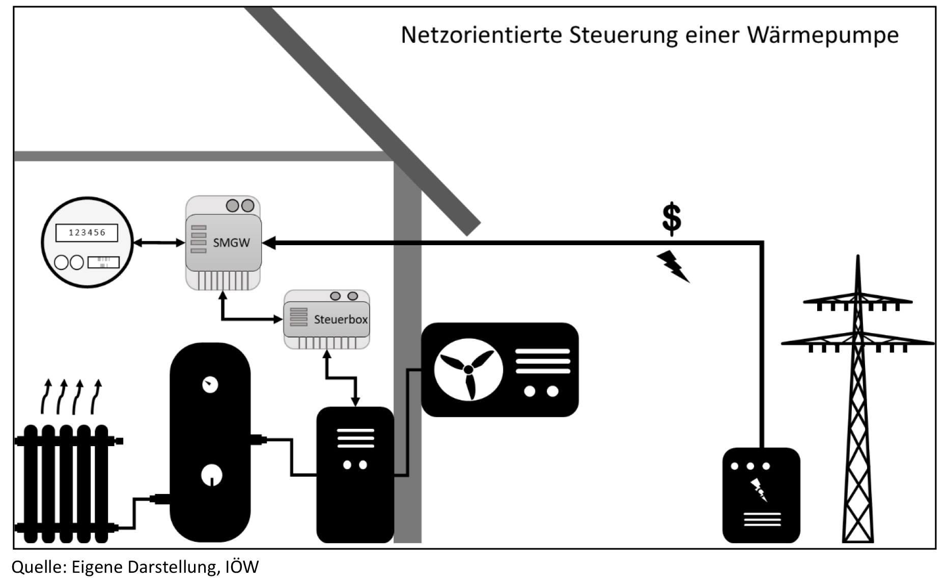 Im Beispiel der Wärmepumpe sind im Referenzfall eine Wärmepumpe, ein Pufferspeicher und die Stromversorgung notwendig. Für die digitale Anwendung sind zusätzlich ein Smart Meter, ein Smart Meter Gateway und eine Steuerbox sowie die Datenübertragung zum Netzbetreiber und dessen Infrastruktur erforderlich.