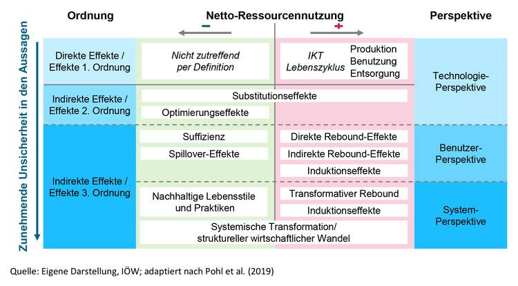 - Indirekte Effekte aus der Nutzer- und Systemperspektive (Effekte dritter Ordnung): Umwelteffekte aus dem Konsumverhalten der Anwender*innen (mit negativen Auswirkungen auf die Umwelt: Rebound- und Induktionseffekte; mit positiven Umweltwirkungen: Suffizienz- und Spillover-Effekte) sowie systemische Effekte wie z. B. ein verminderter Netzausbau oder die Änderung des Strommixes.
