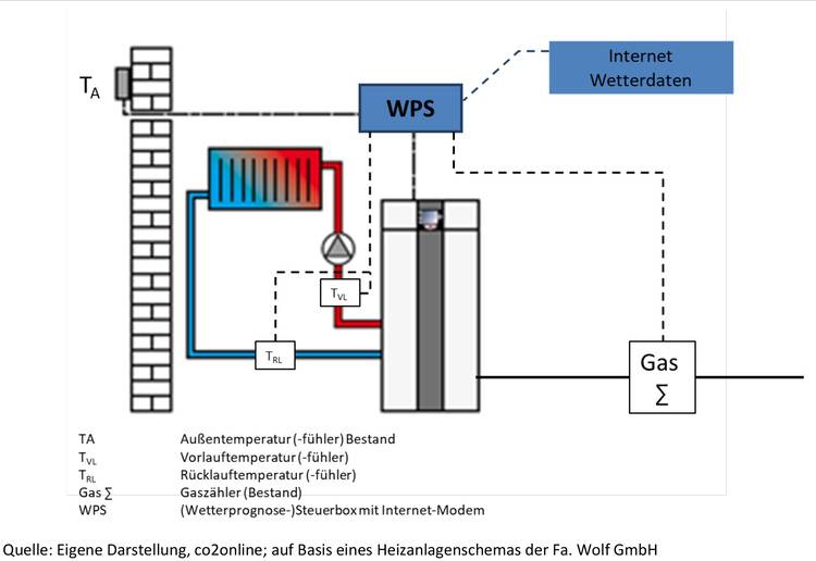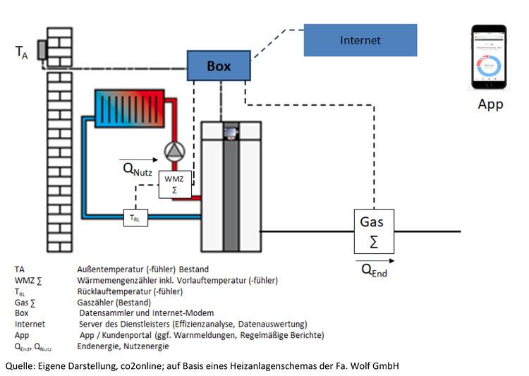 In der Heizzentrale sind hierzu eine Steuerbox mit Datenlogger und Gateway erforderlich, die über Sensoren und Zähler den Gas-, Strom- und Wärmeverbrauch sowie Vorlauf-, Rücklauf- und Außentemperatur sammelt und an einen zentralen Server überträgt, der die Daten auswertet.