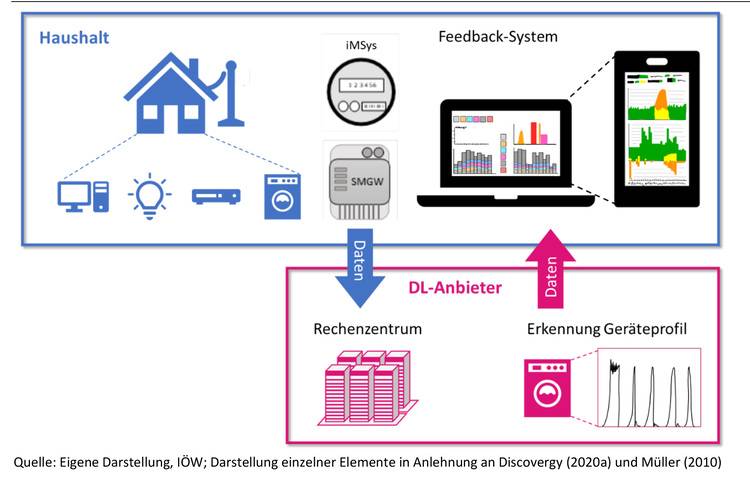 Die Fallstudie betrachtet ein solches Feedback-System. Während im analogen Referenzfall ein Ferraiszähler verbaut ist, benötigt die digitale Anwendung ein Smart Meter, ein Smart Meter Gateway, Visualisierungsmöglichkeiten (über Smartphone) sowie eine Datenübertragung zum Dienstleister und dessen Infrastruktur.