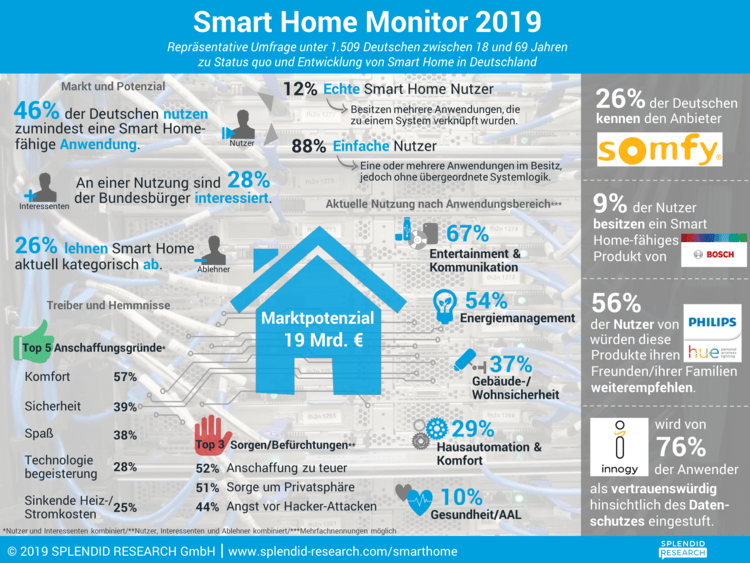 Das Hamburger Marktforschungsinstitut Splendid Research hat im Juli 2019, im Rahmen einer repräsentativen Umfrage, 1.509 Deutsche zwischen 18 und 69 Jahren online zum Thema Smart Home befragt. Die Studie erhebt das Marktpotenzial für Smart Home in Deutschland, die Nutzung und Nutzungsabsicht hinsichtlich verschiedener Smart Home-Produkte, die Treiber und Hemmnisse unterschiedlicher Personengruppen sowie die Bekanntheit, Nutzung und Bewertung zahlreicher Hersteller.