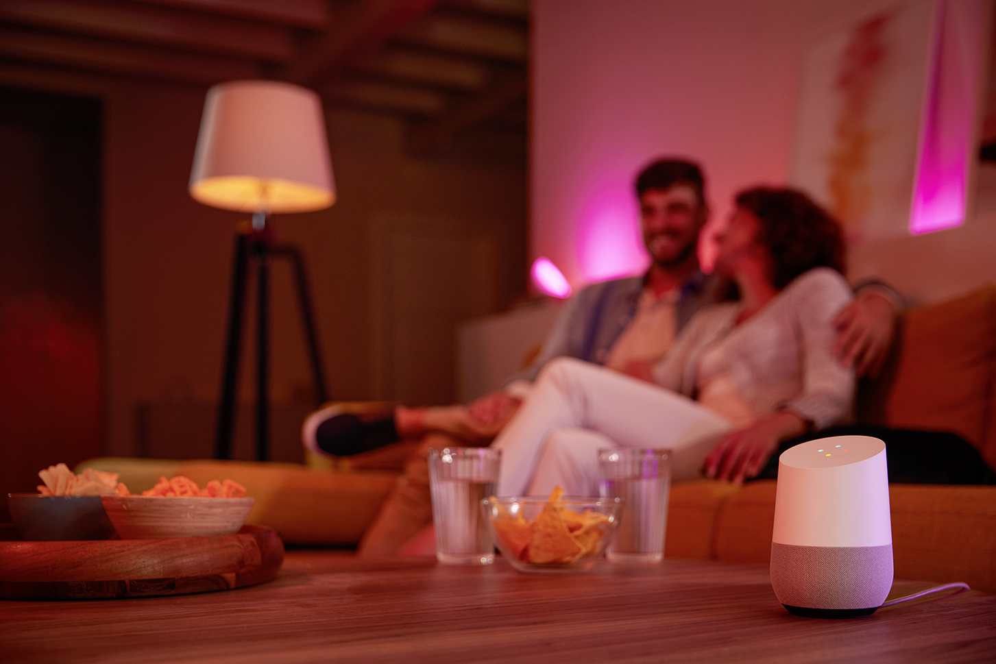 Sehr beliebt ist bei Smarthome-Einsteigern die Steuerung der Beleuchtung. Die Sprachsteuerung, hier z. B. Philips Hue mit Google Home, erleichtert die Bedienung in bestimmten Situationen gravierend.