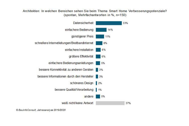 Im Rahmen der Bautrendstudie „Jahresanalyse“ von von BauInfoConsult wurden 150 Architekten in telefonischen Interviews zum Potenzial von Smart Home befragt. Dabei ging es auch um das Verbesserungspotenzial, das die Produktsysteme den Erfahrungen der Planerzunft nach immer noch haben. Ganz vorne sehen die Architekten dabei die Frage rund um den Datenschutz bei Smart Home-Komponenten (33%).