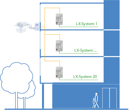 Der LUXORliving M100 Wettersensor von Theben wird an der Hauswand oder auf dem Dach z.B. eines Mehrfamilienhauses oder Apartmenthauses montiert. Die erfassten Wetterdaten (Temperatur, Regen, Wind, Helligkeit) werden zur Auswertung an eine oder bis zu zwanzig LUXORliving M130 Wetterzentralen weitergeleitet. Von hier aus erhalten die LUXORliving Smart Home Systeme der einzelnen Wohneinheiten ihre Steuerbefehle. Somit kann in jeder Wohnung sowohl die Teilnahme der einzelnen Behänge, als auch die definierten Grenzwerte für diese Teilnehmer individuell festgelegt werden.