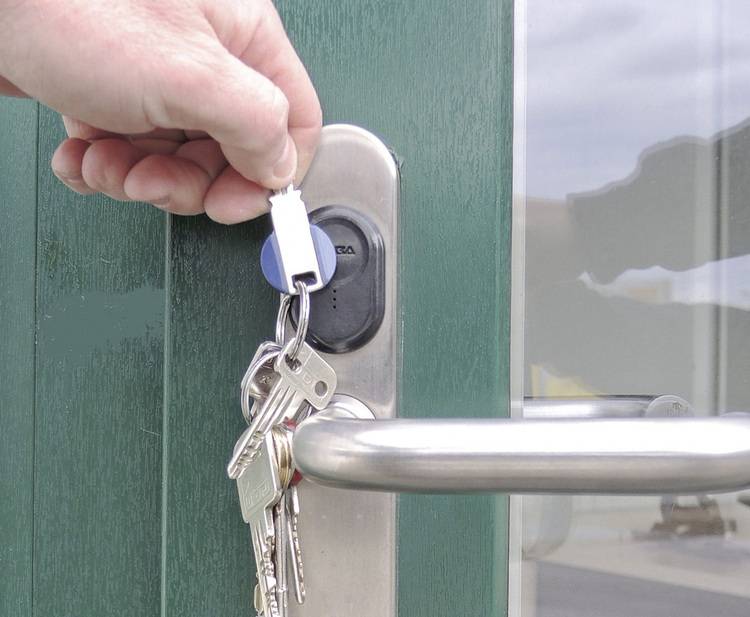Ein RFID-System besteht aus einem Transponder, der sich am oder im Gegenstand befindet und einen kennzeichnenden Code enthält, sowie einem Lesegerät an oder in der Zutrittskontrolle zum Auslesen dieser Kennung, beispielsweise der Kartenleser. Der Transponder kann sich in einer Karte, einem Button oder auch direkt in der Reide eines mechanischen Schlüssels befinden. Bei einigen Ausführungen können auch andere, auf RFID-Basis arbeitende Systeme (z. B. Autoschlüssel) eingespeichert werden.