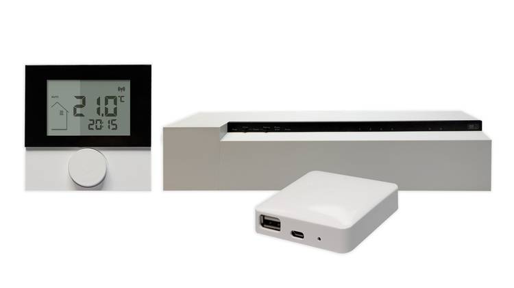 Generell funktioniert das neue Regelsystem als funkbasierte Einzelraumlösung auch ohne Internetverbindung. Dies kann bei der Inbetriebnahme oder zum Test sinnvoll sein. Die smarten Vorteile des Systems - wie die Einrichtung und Bedienung per App rund um die Uhr und von jedem Standort aus - ergeben sich durch die Einbindung eines Gateways. Es vernetzt die Komponenten sicher mit der SmartHome Cloud.