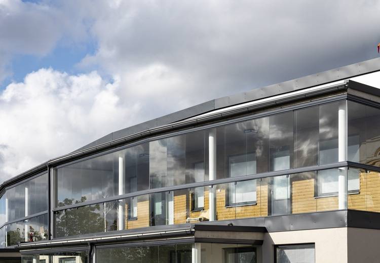 Im Gegensatz zu Holz verfügt Glas über eine glatte, hygienische Oberfläche, die schädliche Partikel und allergieauslösende Pollen abweist. Überdies bedarf Glas relativ wenig Aufwand an Pflege und Wartung - Dreck und Schmutz lassen sich einfach entfernen. Auf diese Weise bildet der Glasanteil quasi eine zweite Haut, die sich ästhetisch ansprechend um die Gebäudehülle legt und so für zusätzlichen Schutz vor Witterung und Feuchteeintritt über die Fassade sorgt.
