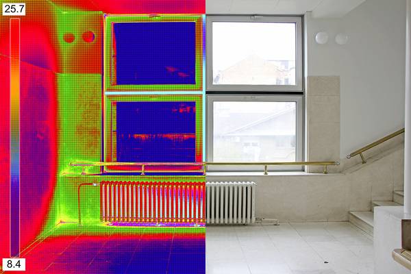 Eine weitere Methode ist die Visualisierung durch Thermografie. Hierbei werden mittels einer entsprechenden Kamera unterschiedlichen Temperaturen unterschiedliche Farben zugeordnet. Farbunterschiede die sich während eines Blower-Door-Tests ergeben, können daher ebenfalls auf eine Undichtheit hinweisen.