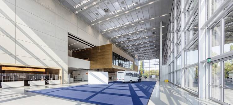 Im 16,5 Meter hohen, transparenten Foyer des Südeingangs an der Düsseldorfer Messe können auch separate Events stattfinden. Die opulenten Glasflächen des ca. 2.000 m² großen Foyers machten ein umfassendes Konzept für den Sonnenschutz und die Verdunkelung erforderlich, wobei man sich bei sämtlichen Screens für Materialien von Serge Ferrari entschieden hat. Da das Gebäude von der Typologie her einen Versammlungsraum darstellt, mussten auch erhöhte Brandschutzanforderungen berücksichtigt werden. Ausgeführt wurde das Screenmaterial Soltis SK20 von Serge Ferrari, das speziell für öffentliche Gebäude und Verwaltungsbauten mit hohem Publikumsverkehr entwickelt wurde. Mit seiner Brandschutzklassifizierung Euroklasse A2-s1,d0 verspricht es eine sehr hohe Sicherheit im Innenbereich, und bietet ganz nebenbei einen guten Gesamtenergiedurchlassgrad von 0,26.