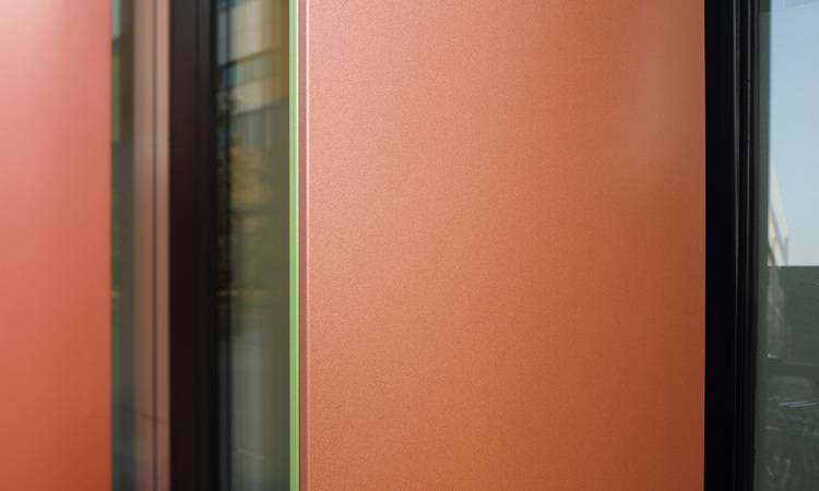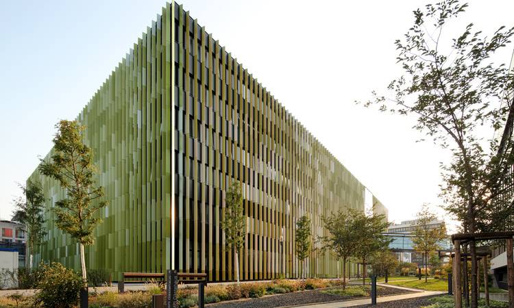 Um einen hohen Wiedererkennungswert zu erzeugen, entwarfen die Planer von kadawittfeldarchitektur ein einzigartige, zweifarbige Lamellenfassade. Vorgehängte Aluminium-Lamellen mit einem dreieckigen Querschnitt erstrecken sich vertikal über die gesamte Gebäudehöhe. Sie stellen zwei verschiedene Abbildungen dar, die jeweils ein stilisiertes Blätterdach imitieren. Die eine Lamellen-Seite wurde in unterschiedlichen Rottönen lackiert, die andere in Grüntönen beschichtet.