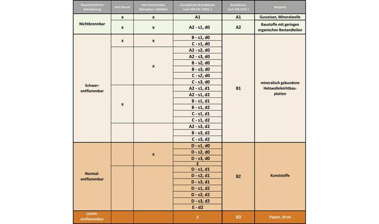 In Deutschland ist momentan die Klassifizierung des Brandverhaltens von Baustoffen sowohl nach DIN 4102-1 als auch nach DIN EN 13 501-1 möglich. Nur bei Bauprodukten und Bauarten, die der CE-Kennzeichnung unterliegen, ist eine Brandklassifizierung nach der DIN EN 13501-1 zwingend erforderlich (Bild 2).