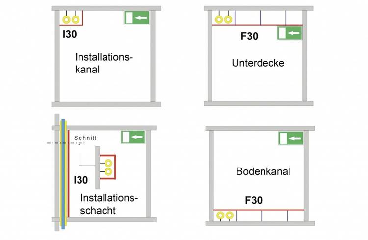 Hiernach dürfen brennbare Leitungen in Flucht- und Rettungswegen nicht frei verlegt werden. In der Regel ist dann eine brandschutztechnische Kapselung durch die Verlegung innerhalb von Unterdecken, Bodenkanälen oder Installationsschächten mit einer Feuerwiderstandsdauer von 30 Minuten (F 30) erforderlich. Nichtbrennbare Leitungen hingegen dürfen in Flucht- und Rettungswegen frei verlegt werden (Bild 3 und 4). Brandlasten müssen keine berücksichtigt werden.