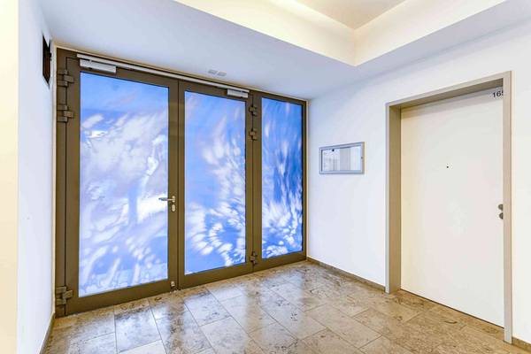 Weiß wie Wolken, verwischt, verschwimmend vor intensivem Blau: Morphische Felder, die Assoziationen zu Himmelsbildern wecken. In den beiden Treppenhäusern, den Eingängen, Fluren und der Lobby der Neubauten der Residenz am Postplatz finden sich die Motive der Künstlerin Julia Bornefeld als Digitaldruck auf zahlreichen Glasflächen: auf Türen, Wänden, in Fahrstühlen, auf Bänken oder freihängenden Lampen – und auf den Brandschutztüren.