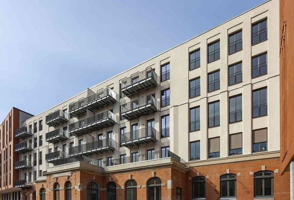 Auf einem 7.618 m2 großen Grundstück entstand so eine Vermietungsfläche von insgesamt 20.052 m2 mit 188 Wohneinheiten im Neubau, 58 Wohnungen im Altbau sowie vier Gewerbeeinheiten. Großzügige Loggien prägen die Fassade des monolithischen Ergänzungskörpers, die der Struktur des historischen Bestandes folgen.