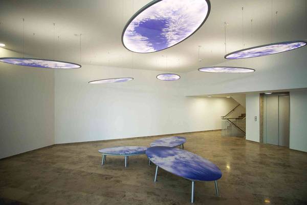 Die Lichtinstallationen nehmen Bezug auf historische Malerei und Deckenmalerei zum Thema Himmel und Planeten. Durch die Semitransparenz der Glasflächen vermitteln sie zugleich Tiefe und Leichtigkeit und entfalten eine starke Strahlkraft.