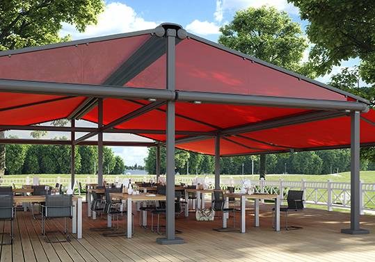 Um kleine, aber auch große Flächen flexibel vor Sonne zu schützen, bietet Markisenexperte markilux zwei freistehende Systeme: das wandlungsfähige Markisenständersystem „syncra“, für Sitzplätze im Garten, für Cafés und Restaurants und das individuell gestaltbare Rahmensystem „construct“ für Großraumbeschattung.