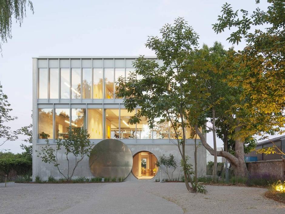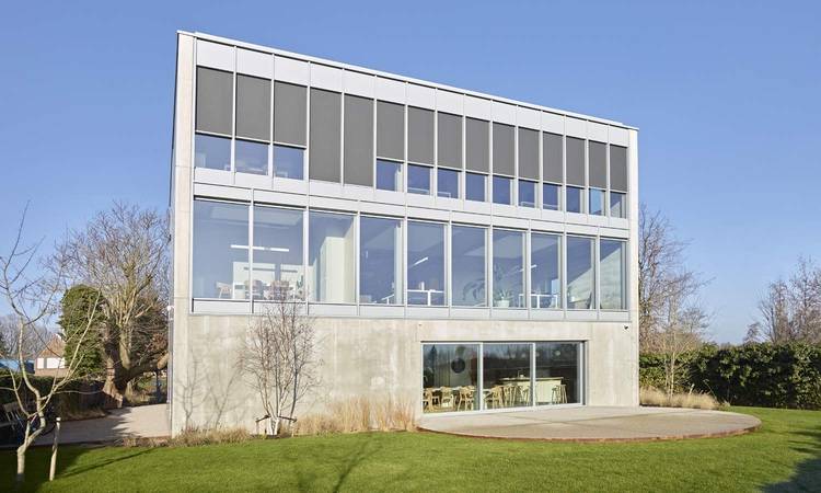 „Ein Entwurf kommt selten von einem Architekten allein“, erklärt Sander Verhanneman (Architekt – Rohm). „Für sein neues Büro wollte Hannibal gerade den Charakter des Gartens erhalten. Deshalb haben wir die Grundfläche des Gebäudes so klein wie möglich gehalten. Daher waren wir zwar gezwungen, drei Stockwerke zu bauen, aber glücklicherweise war die Stadt Roeselare damit einverstanden. Ein Vorteil davon ist aber, dass man nun vom zweiten Stock aus die Skyline der Stadt sieht – ein schöner Orientierungspunkt. Aus Budgetgründen haben wir uns bei diesem Projekt für einen industriellen Ansatz entschieden, aber gerade diese grauen und starren Elemente bieten die nötige Ruhe im Kontrast zum Grün des Gartens.“