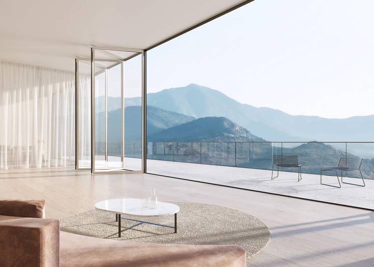 Im Gegensatz zu klassischen Schiebetüren, bei denen auch im geöffneten Zustand eine große Glasfläche stets im Sichtfeld bleibt, lassen sich die einzelnen Elemente der Glas-Faltwände zu einem schmalen Paket an die Seite falten. Aber auch geschlossen transportieren die Glas-Faltwände viel Tageslicht ins Gebäudeinnere und bieten fast uneingeschränkte Ausblicke ins Freie: Die einzelnen Faltelemente von Solarlux sind – abhängig vom System Ecoline oder Highline – bis zu 3,5 Meter hoch und 1,10 Meter breit und bestechen durch ihre filigranen Ansichtsbreiten von nur 99 Millimeter im Flügelstoß.