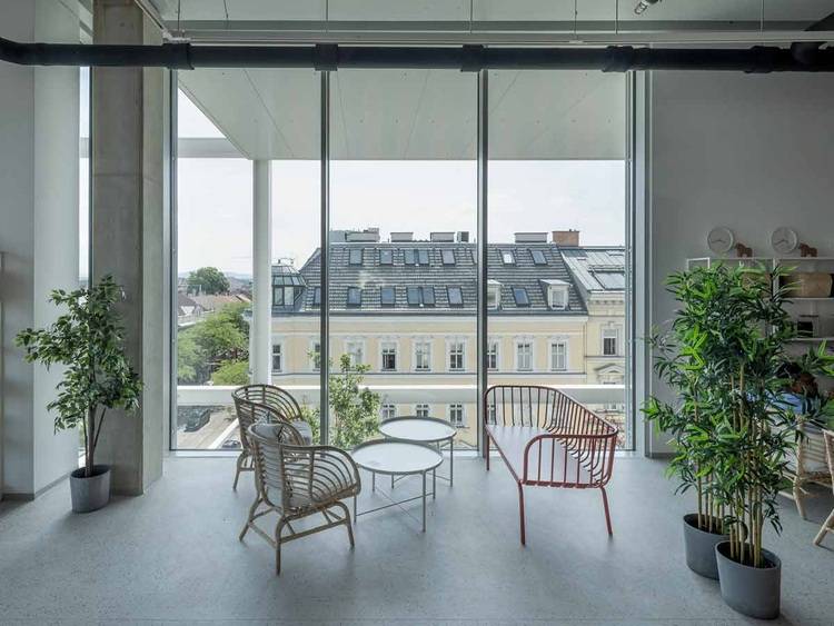 Aus den Hostelräumen fällt der Blick auf die umliegende Wiener Dachlandschaft – weitgehend unbehindert von den nur 50 mm schlanken Fassadenprofilen.