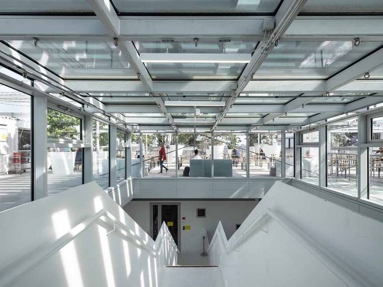 Die unteren fünf Ebenen sind zum Atrium offen. Im fünften Obergeschoss trennt eine Brandschutzfassade vom Typ Jansen VISS Fire das Hostel vom großen Luftraum. Treppen führen von hier zur öffentlich zugänglichen Dachterrasse.