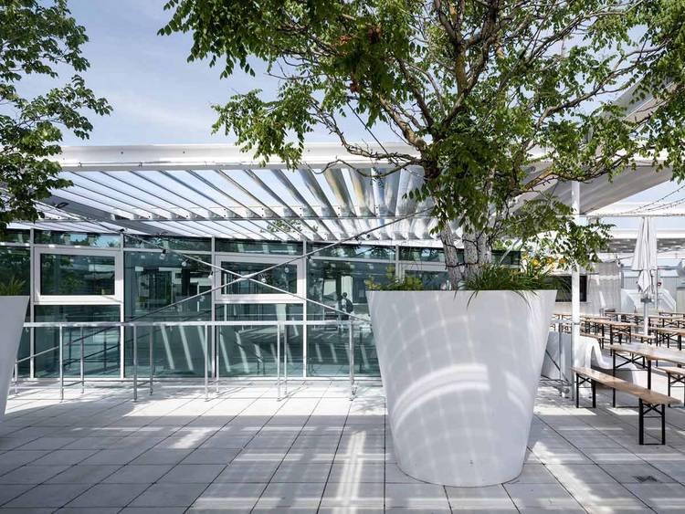 Ganz oben im Atrium geht es hinaus zur Dachterrasse. Für die Dachverglasung wählten die Architekten das Aufsatzsystem Schüco AOC 50 ST auf einer Stahl-Unterkonstruktion.