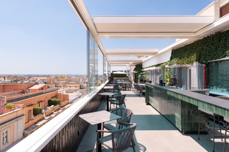 Das traditionsreiche Hotel Universo, geführt von der Familie Roscioli, hat seine Dachterrasse umfassend modernisiert. Ziel war es, einen exklusiven Veranstaltungsraum zu schaffen, der Schutz vor Regen und Sonne bietet, ohne den Blick auf die Stadt zu versperren.