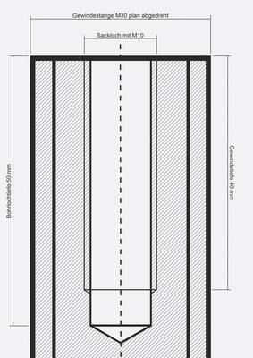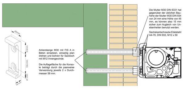 Im vorliegenden Fall war der Montageuntergrund Beton, und damit in Bezug auf Lochabstände und Lasten unbedenklich. Der Lösungsvorschlag wurde mit Gewindestangen in M30 entwickelt, auf die zum Einstellen eine 1,5 fach hohe Mutter aufgedreht wird. Die Befestigungsschraube der Konsole wird im Sackloch der Gewindestange verschraubt. Da die Schraube M12 und die Mutter M30 gegenseitig gekontert werden, kann hier nichts passieren. Die höhere Mutter lässt mit der entsprechenden Sicherheit 15 mm zum Einstellen auf der Klinkerfassade zu. Die Gewindestange M30 ist ausreichend stabil, um die entstehenden Lasten bei der vorgegebenen Menge von Konsolen aufzunehmen.