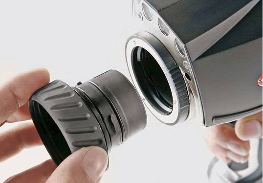 IR-Profikameras für den Baubereich sollten standardmäßig mit einem für die Fassaden- und Raumthermografie geeigneten Weitwinkelobjektiv (z. B. 8 – 15 mm) mit großem Sehfeld ausgeliefert werden, das optional durch Standard- (z. B. 30 – 50 mm) und Teleobjektive (z. B. 60 – 130 mm) erweiterbar sein sollte. Eine automatische Objektiverkennung macht den Objektivwechsel komfortabler und beugt Messfehlern vor, doch nicht alle Kameras haben sie. Kameras mit IR-Zoomobjektiv gibt es auch schon (z. B. von Avio/NEC), wobei aus technischen Gründen nur feste Zoomschritte möglich sind (z. B. 10, 20, 30 und 40 mm).