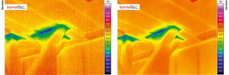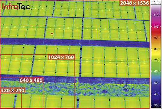 Außerdem ist man schneller: Während bei großen Objekten mit Low-Cost- oder Einsteiger-Kameras geringerer Auflösung mehrere Aufnahmen notwendig sind, um Details erkennen zu können, reicht mit einer Profi-Kamera meist eine einzige Aufnahme. Das beschleunigt die thermografische Erfassung vor Ort, aber auch die Auswertung der Wärmebilder im Büro.