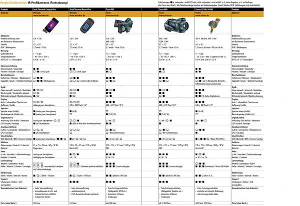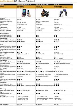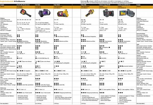 Vor allem im mittleren Preissegment ist die Kamera-Modellvielfalt inzwischen sehr groß. Anbieter wie Avio/NEC, Flir Systems, Fluke, Testo oder InfraTec haben gleich mehrere Modelle im Programm. Im High-End-Bereich ist das Angebot etwas kleiner. Berücksichtigt wurden in der tabellarischen Übersicht Kameras mit einer Detektorauflösung ab 320 × 240 IR-Pixel. Aus Platzgründen konnte jeder Anbieter maximal Daten von zwei Geräten seiner Wahl zur Verfügung stellen – sofern vorhanden ein Mittelklasse- und ein High-End-Modell.